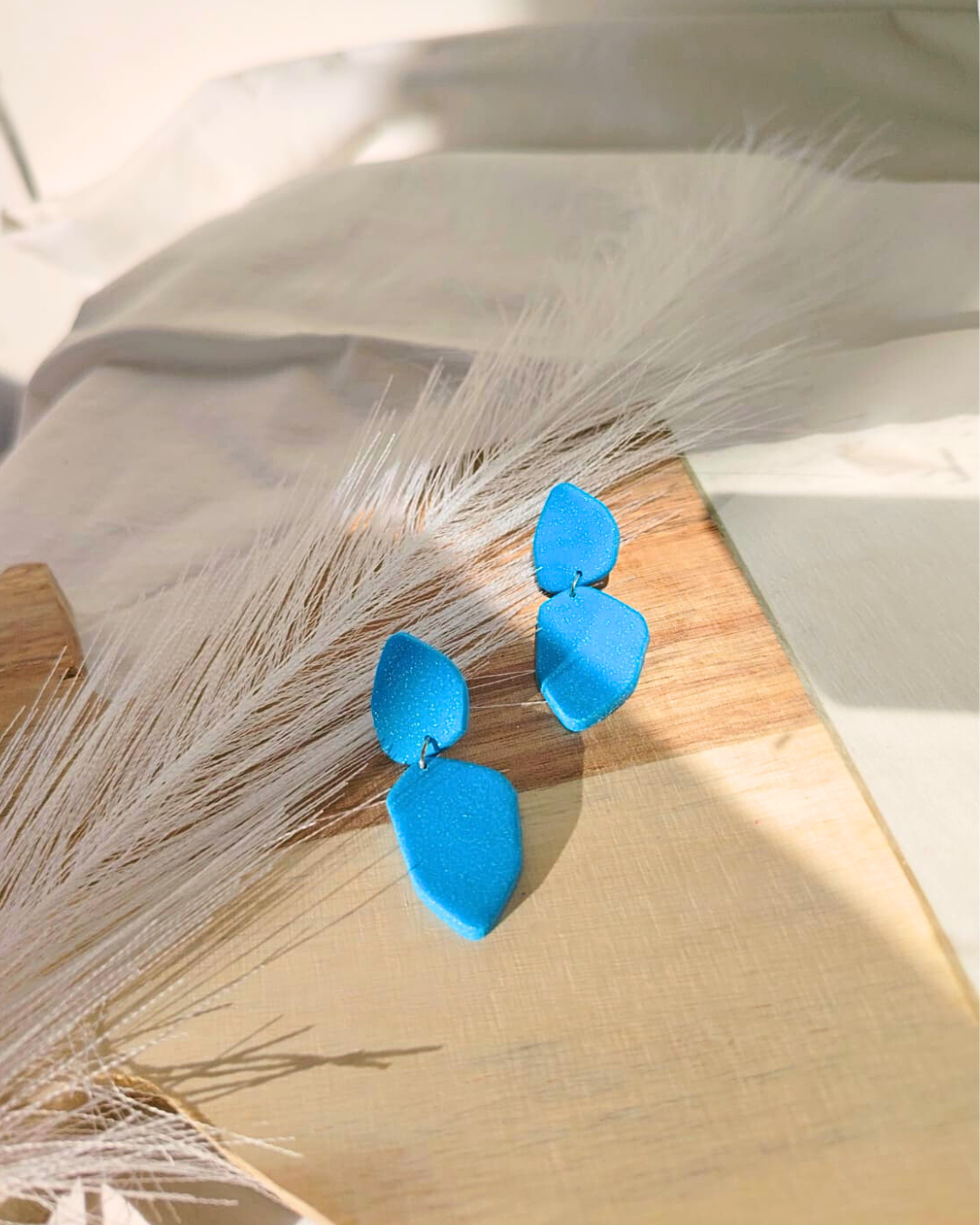 The earrings are made from polymer clay, a lightweight and durable material shaped by hand and oven-baked for longevity. Shiny parts are coated with UV resin for extra shine and protection, while matte finishes use a clay-specific coating.