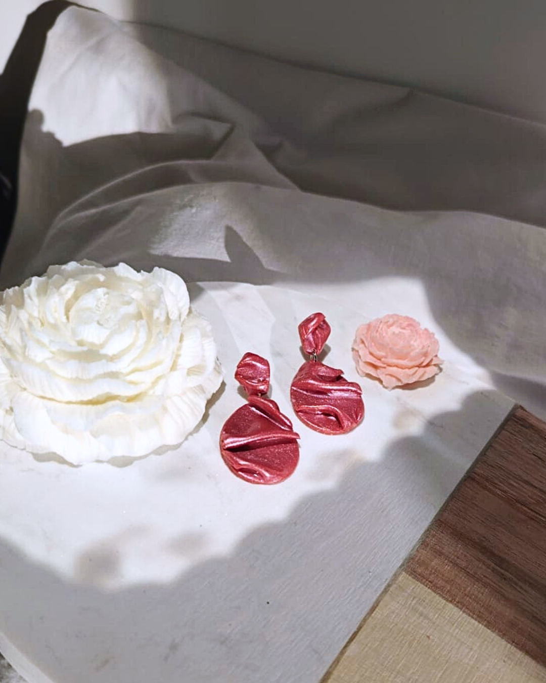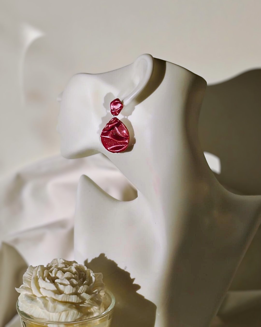 The earrings are made from polymer clay, a lightweight and durable material shaped by hand and oven-baked for longevity. Shiny parts are coated with UV resin for extra shine and protection, while matte finishes use a clay-specific coating.