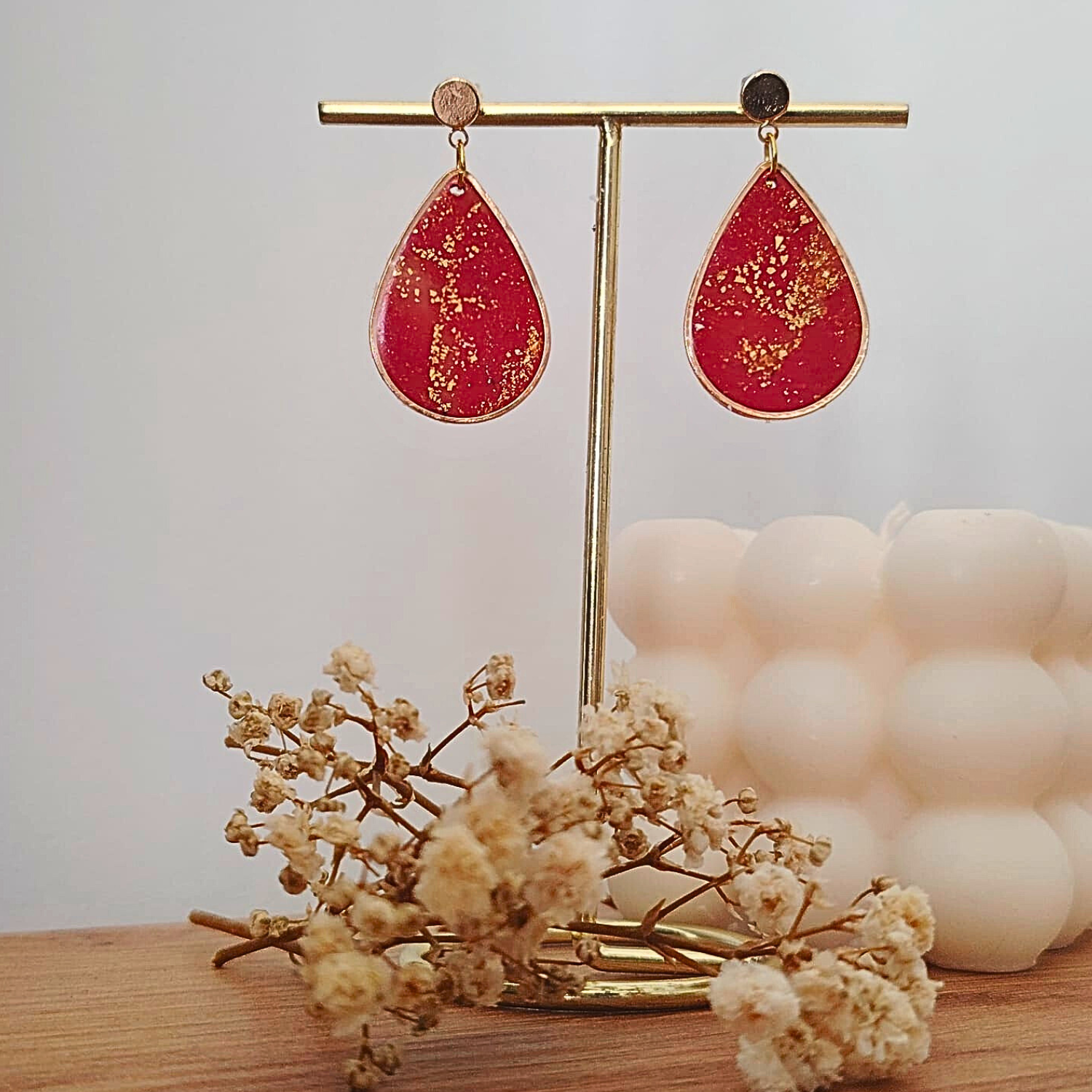 Red Drop - Elegantne crveno zlatne viseće naušnice, ručno izrađene od polimer gline