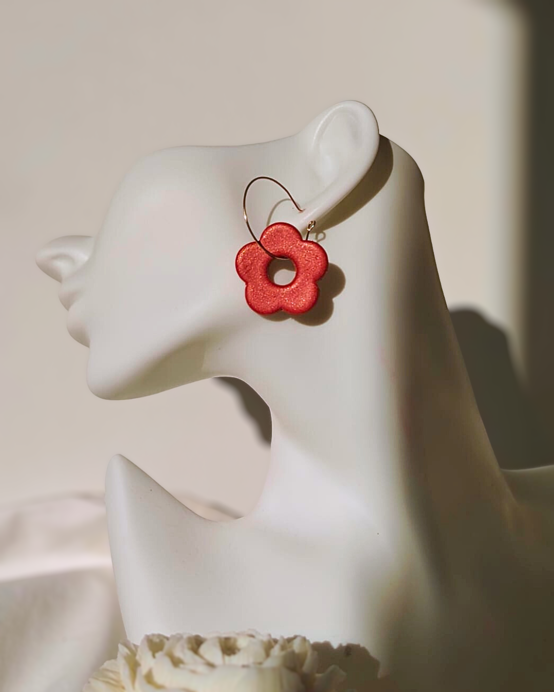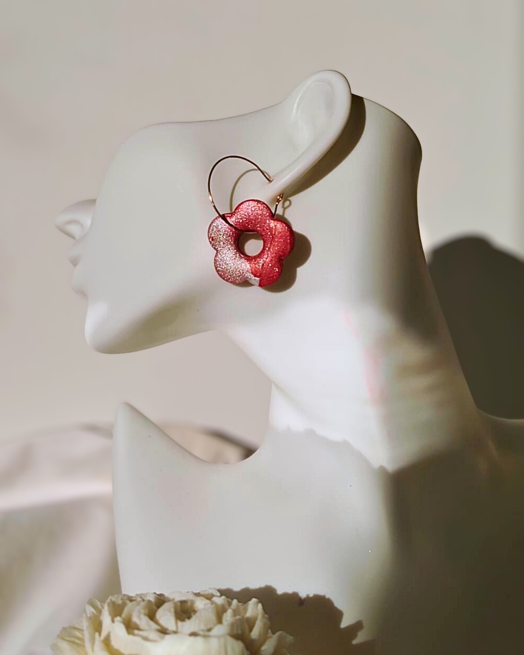 The earrings are made from polymer clay, a lightweight and durable material shaped by hand and oven-baked for longevity. Shiny parts are coated with UV resin for extra shine and protection, while matte finishes use a clay-specific coating.